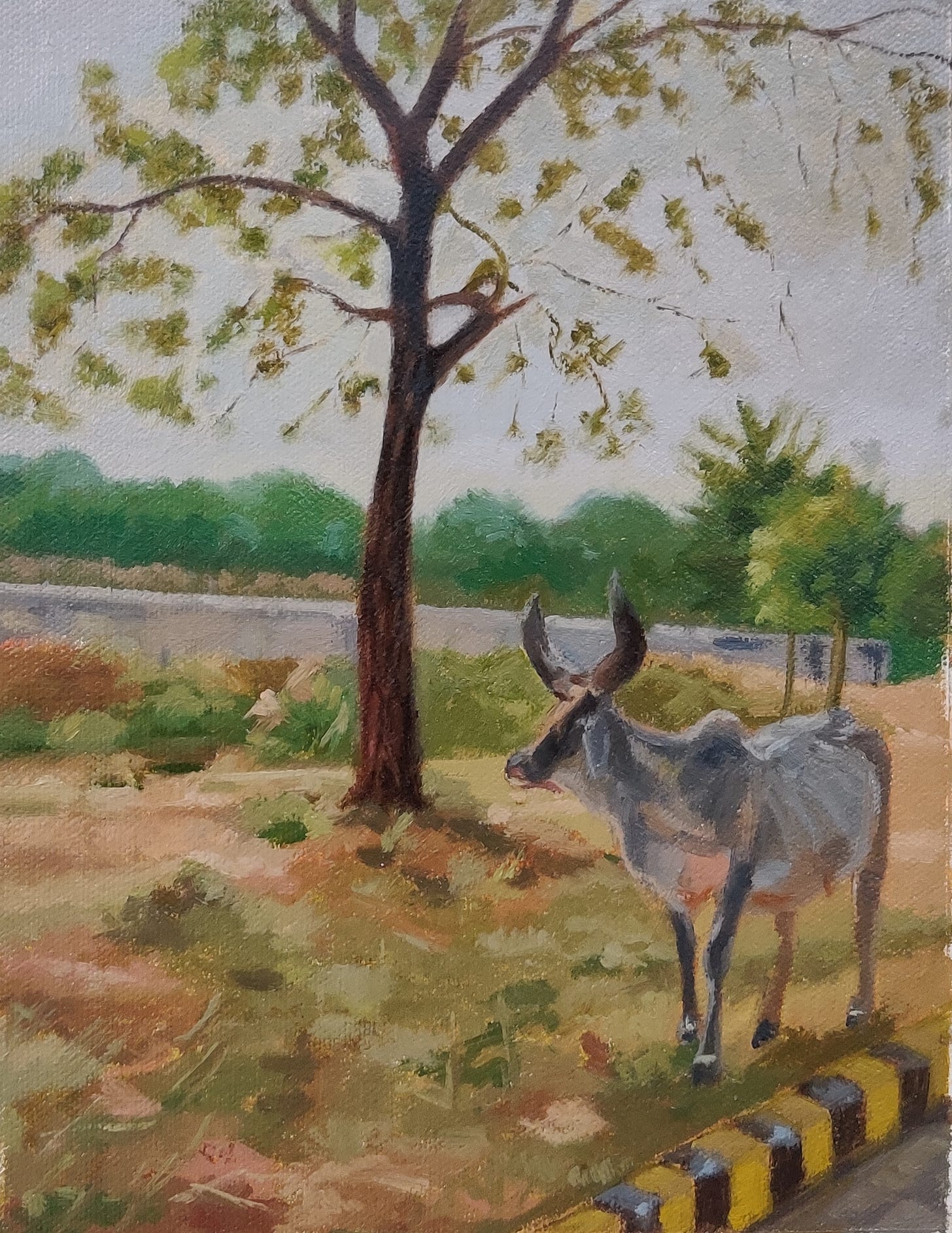 So after squandering away another two hours, YouTube vlogs, and scrolling on Pinterest, my face slacked by gravity and my eyes loopy. I decided to pick up the pictures of this cow for my next painting. I was very much aware it's not a very good reference, the size of my canvas was quite small so the details won't appear.